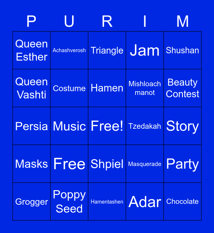 This bingo card has a free space and 25 words: Free, Hamentashen, Hamen, Grogger, Shushan, Queen Esther, Queen Vashti, Achashverosh, Tzedakah, Shpiel, Mishloach manot, Persia, Masquerade, Party, Costume, Purim, Story, Triangle, Beauty Contest, Music, Chocolate, Poppy Seed, Masks, Jam and Adar.