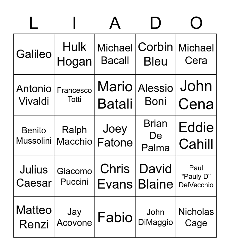 This bingo card has 75 words: Giuseppe Verdi, Brian Austin Green, Mario Batali, Chaz Bono, Steve Carell, Andrea Bocelli, Chad Allen, Vincent D'Onofrio, Jon Bon Jovi, Adam Carolla, Luciano Pavarotti, Alan Alda, Chris Evans, Alessio Boni, David Caruso, Antonio Vivaldi, Jay Acovone, Fabio, Danny Bonaduce, John Cena, Leonardo da Vinci, Hulk Hogan, Joey Fatone, Corbin Bleu, Michael Cera, Michelangelo, Jonas Brothers, Scott Baio, Robert Blake, Hayden Christensen, Joe Mantegna, Jimmy Kimmel, Jon Favreau, David Blaine, Eddie Cahill, Galileo, Matt LeBlanc, Lou Ferrigno, Brian De Palma, Nicholas Cage, Antonio Meucci, Jay Leno, Guy Fieri, Jason Biggs, Mark Consuelos, Christopher Columbus, Ralph Macchio, Michael Bacall, Danny DeVito, Steve Buscemi, Marco Polo, Francesco Totti, Frankie Avalon, Michael Bergin, Bradley Cooper, Silvio Berlusconi, Sophia Loren, Armand Assante, Tony Bennett, Michael Buble, Matteo Renzi, Monica Bellucci, Paul Giamatti, Leonardo DiCaprio, Tony Danza, Benito Mussolini, Giorgio Armani, Michael Angarano, Jean Paul Belmondo, Paul "Pauly D" DelVecchio, Julius Caesar, Giacomo Puccini, Tony Amendola, John DiMaggio and Robert De Niro.