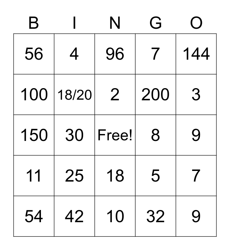 This bingo card has a free space and 24 words: 25, 42, 2, 54, 144, 56, 100, 4, 8, 18, 200, 150, 5, 7, 18/20, 32, 9, 96, 3, 30, 9, 11, 7 and 10.