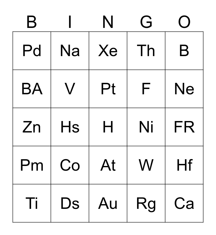 This bingo card has a free space and 24 words: Co, Ds, Pt, Ti, B, Pd, BA, Na, Ni, At, F, Zn, W, Hf, V, Rg, FR, Xe, Ne, Hs, Ca, Pm, Th and Au.