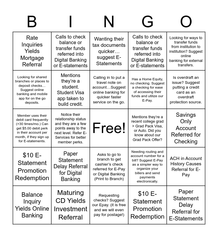 This bingo card has a free space and 24 words: Paper Statement Delay Referral for Digital Banking, Maturing CD Yields Investment Referral, Calling in to put a travel note on account…Suggest online banking for quicker faster service on the go., Balance Inquiry Yields Online Banking, Looking for ways to transfer funds from institution to institution? Suggest online banking for external transfers., Rate Inquiries Yields Mortgage Referral, Looking for shared branches or places to deposit checks…Suggest online banking and mobile app for on the go deposits., Calls to check balance or transfer funds referred into Digital Banking or E-statements, Mentions they’re a recent college grad > Grad Pack Visa, or Auto. Did you know about our Grad Pack Offer?, Asks to go to branch to get cashier’s check referred for E-Pay or Digital Banking (Print to Branch), Has a Home Equity, no checking. Suggest a checking for ease of accessing their funds and utilize our E-Pay., Member uses their debit card frequently (>30 times/mo.) Can get $5.00 debit perk in their account per month, if they sign up for E-statements., Needing routing and account number for a bill? Suggest E-Pay as a simpler way to organize your billers and send payments electronically., ACH in Account History Causes Referral for E-Pay, Mentions they’re a student. Student Visa app taken to build credit., $10 E-Statement Promotion Redemption, Savings Only Account Referred for Checking, Wanting their tax documents quicker…suggest E-Statements, Is overdraft an issue? Suggest putting a credit card as an overdraft protection source., Notice their relationship status and they are a few points away to the next level. Refer E-Services for better member perks., Paper Statement Delay Referral for E-Statements, $10 E-Statement Promotion Redemption, Calls to check balance or transfer funds referred into Digital Banking or E-statements and Requesting checks? Suggest our Epay. (it is free and we will even pay for postage!).