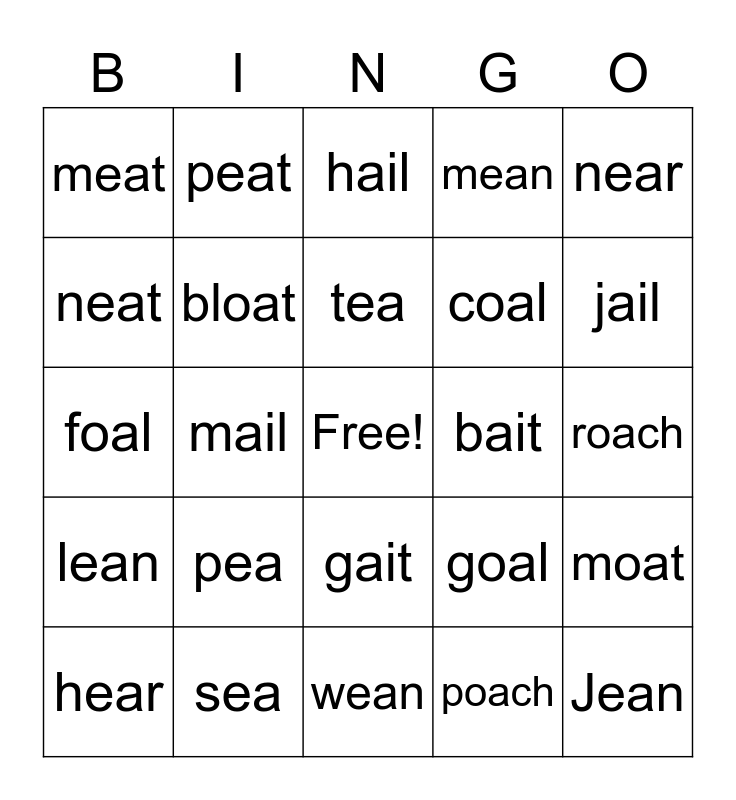 This bingo card has a free space and 24 words: pea, sea, tea, hear, near, meat, neat, peat, bait, gait, coal, foal, goal, moat, bloat, poach, roach, hail, jail, mail, Jean, lean, mean and wean.