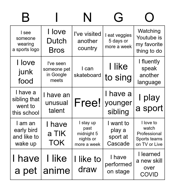 This bingo card has a free space and 29 words: I have a pet, I can play an instrument, I have an unusual talent, I know someone in this class from before, I see someone wearing a sports logo, I've visited another country, I've seen someone pet in Google meets, I have a TIK TOK, I have a younger sibling, I like anime, I play a sport, I learned a new skill over COVID, I like to draw, I have performed on stage, I fluently speak another language, I have my own cellphone, I stay up past midnight 5 nights or more a week, I am an early bird and like to wake up, Watching Youtube is my favorite thing to do, I have a sibling that went to this school, I want to play a sport at Cascade, I play video games, I like to sing, I love junk food, I eat veggies 5 days or more a week, I love Dutch Bros, I love to watch Professional Sports teams on TV or Live, I can skateboard and I love chocolate.