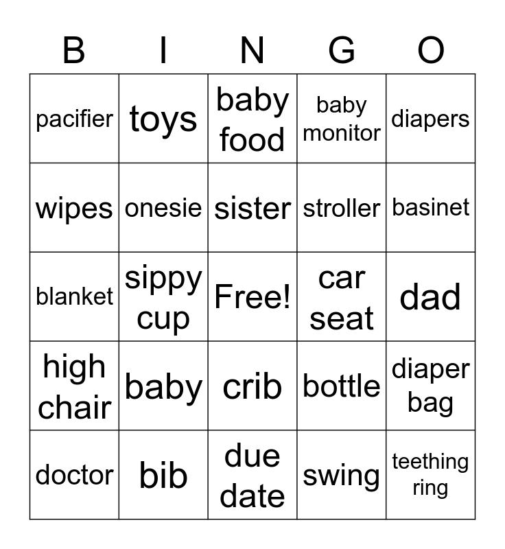 This bingo card has a free space and 25 words: baby, due date, sister, doctor, diapers, pacifier, wipes, toys, car seat, crib, stroller, blanket, bottle, diaper bag, onesie, mom, dad, baby food, basinet, sippy cup, teething ring, bib, high chair, baby monitor and swing.