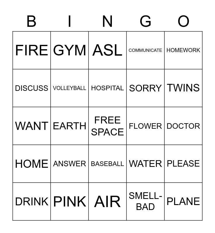This bingo card has a free space and 24 words: ANSWER, PINK, HOSPITAL, DRINK, HOMEWORK, FIRE, DISCUSS, GYM, FLOWER, BASEBALL, SORRY, WANT, WATER, PLEASE, VOLLEYBALL, SMELL-BAD, DOCTOR, ASL, TWINS, EARTH, PLANE, HOME, COMMUNICATE and AIR.