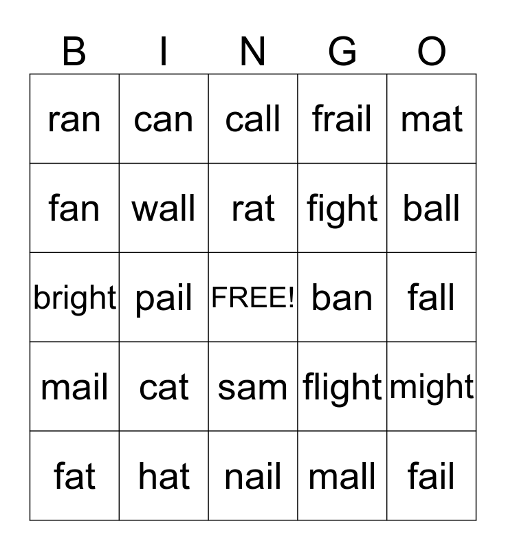 This bingo card has a free space and 24 words: cat, hat, rat, fat, mat, ran, fan, can, ban, sam, fight, bright, flight, might, wall, mall, fall, call, ball, pail, fail, mail, frail and nail.