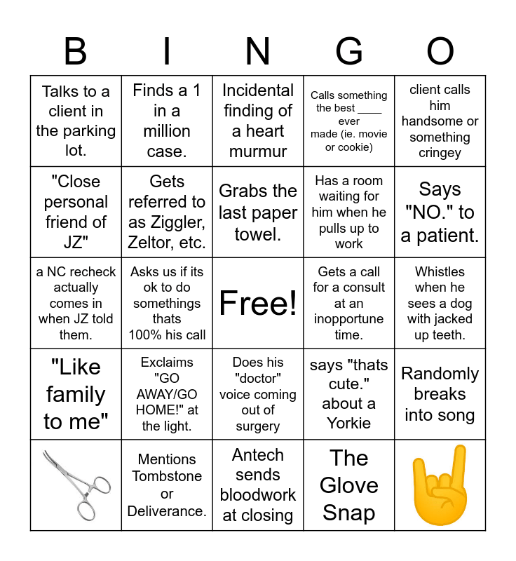 This bingo card has 2 images, a free space and 22 words: Exclaims "GO AWAY/GO HOME!" at the light., Mentions Tombstone or Deliverance., Grabs the last paper towel., client calls him handsome or something cringey, Talks to a client in the parking lot., "Close personal friend of JZ", Finds a 1 in a million case., Gets a call for a consult at an inopportune time., Does his "doctor" voice coming out of surgery, Has a room waiting for him when he pulls up to work, a NC recheck actually comes in when JZ told them., says "thats cute." about a Yorkie, Randomly breaks into song, Gets referred to as Ziggler, Zeltor, etc., The Glove Snap, Whistles when he sees a dog with jacked up teeth., Incidental finding of a heart murmur, Says "NO." to a patient., Asks us if its ok to do somethings thats 100% his call, "Like family to me", Calls something the best ____ ever made (ie. movie or cookie) and Antech sends bloodwork at closing.