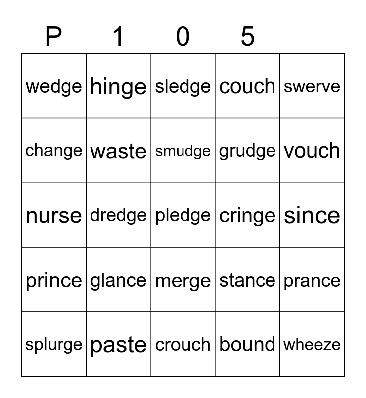 This bingo card has a free space and 24 words: glance, paste, smudge, splurge, swerve, wedge, change, hinge, cringe, merge, grudge, nurse, stance, prance, waste, bound, since, sledge, vouch, dredge, wheeze, prince, couch and crouch.