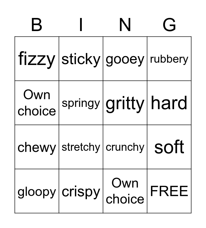 This bingo card has 16 words: crispy, soft, gooey, fizzy, chewy, sticky, crunchy, Own choice, Own choice, springy, gloopy, rubbery, stretchy, hard, gritty and FREE.