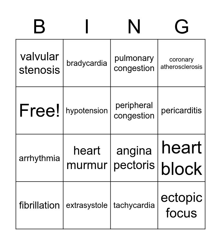 This bingo card has 16 words: extrasystole, heart block, pulmonary congestion, valvular stenosis, arrhythmia, bradycardia, angina pectoris, tachycardia, Free!, hypotension, fibrillation, coronary atherosclerosis, heart murmur, pericarditis, peripheral congestion and ectopic focus.