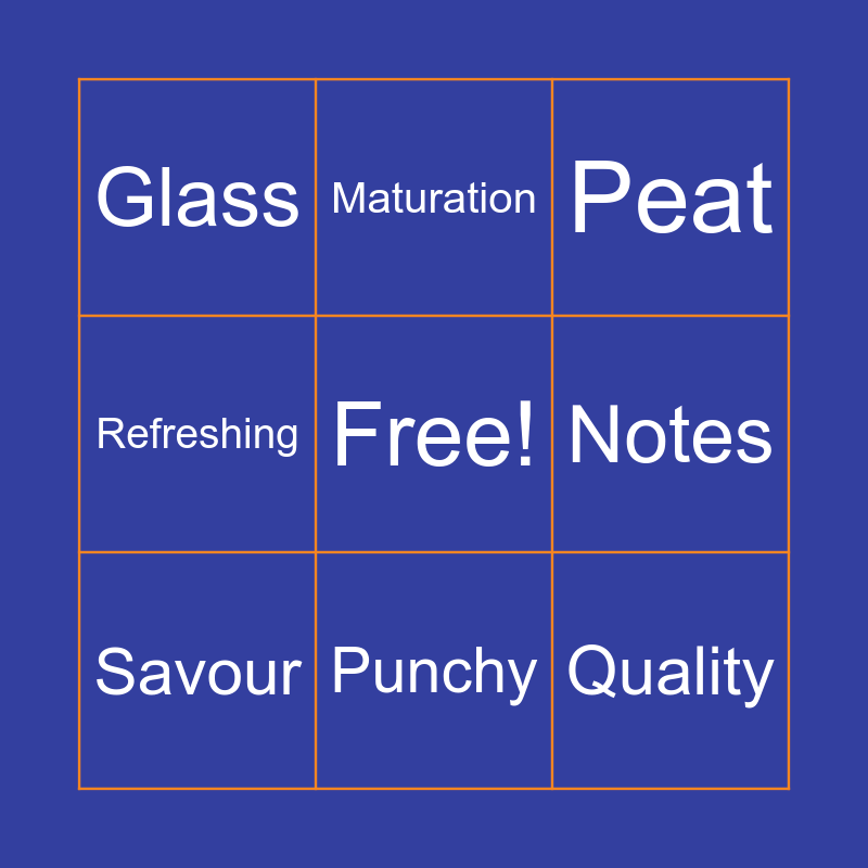 This bingo card has a free space and 50 words: Scent, Taste, Bottle, Foam, Palette, Dry, Maturation, Aroma, Notes, Froth, Savour, Refreshing, Premium, Volume, Nose, Pint, Punchy, Strong, Mouth-feel, Quality, ABV, Swirl, Glass, Fizz, Full Body, Sophisticated, Hops, Explorer Series, Peat, 7.40%, 500ml, Barrel-aged, World Famous, Laphroaig, Single-malt, Amber Scotch Ale, Warming, Stunning Packaging, 3 Scottish Craft Businesses, Taste of Islay, Craftmanship, Limited-edition, Fusion, Hope Blamarie, smoke/smokey, iodene, brine, earthy, chewy and maltiness.