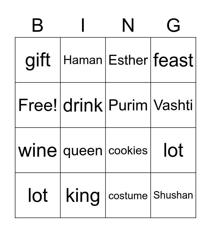 This bingo card has 16 words: king, lot, Esther, gift, wine, Haman, cookies, costume, Free!, drink, lot, feast, queen, Vashti, Purim and Shushan.