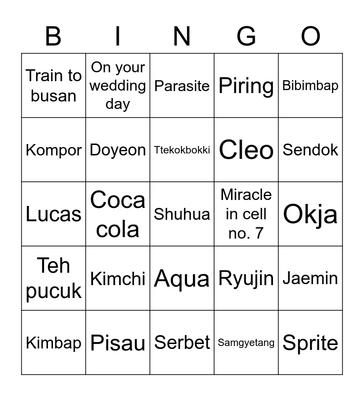 This bingo card has a free space and 24 words: Kimbap, Kimchi, Ttekokbokki, Samgyetang, Bibimbap, Train to busan, On your wedding day, Parasite, Miracle in cell no. 7, Okja, Lucas, Doyeon, Ryujin, Jaemin, Kompor, Pisau, Serbet, Piring, Sendok, Teh pucuk, Coca cola, Aqua, Cleo and Sprite.