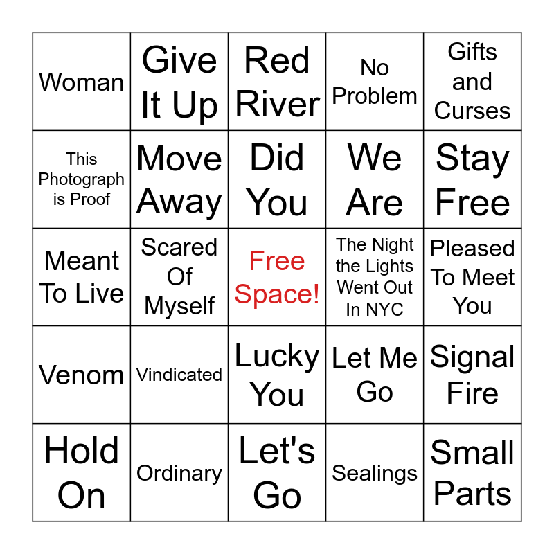 This bingo card has a free space and 24 words: Vindicated, Ordinary, Did You, Hold On, Gifts and Curses, Woman, This Photograph is Proof, Give It Up, The Night the Lights Went Out In NYC, Lucky You, We Are, Meant To Live, Let Me Go, Signal Fire, Move Away, Sealings, Pleased To Meet You, Red River, Stay Free, Scared Of Myself, Small Parts, Venom, No Problem and Let's Go.