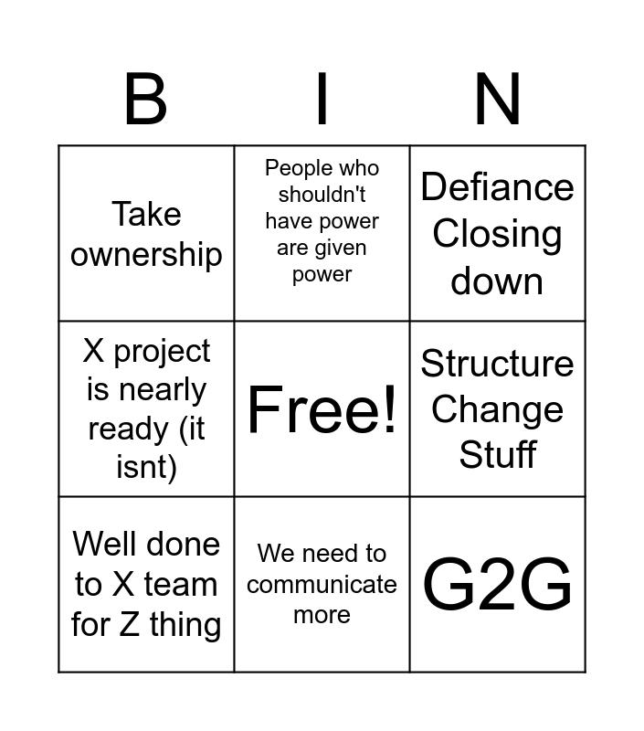 This bingo card has a free space and 13 words: Sales are bad and we need to improve, Blames X department for Z issue, Well done to X team for Z thing, People who shouldn't have power are given power, X project is nearly ready (it isnt), G2G, A lie about Atlas Rogues, LC Level Cap went live, We need to communicate more, Take ownership, Structure Change Stuff, Defiance Closing down and Stuff about AA Merge.
