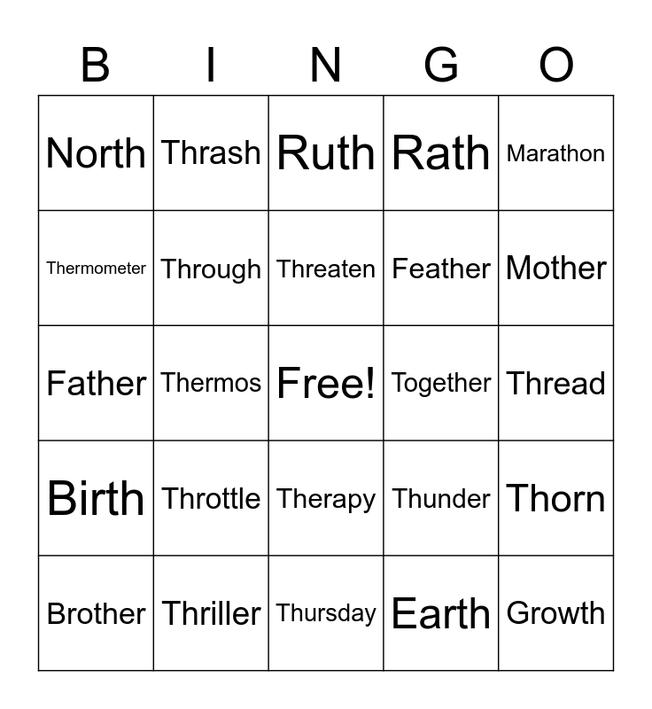 This bingo card has a free space and 24 words: Throttle, Thriller, Threaten, Brother, Marathon, North, Thermometer, Thrash, Together, Therapy, Feather, Father, Thunder, Thorn, Through, Earth, Thread, Ruth, Mother, Thermos, Growth, Birth, Rath and Thursday.