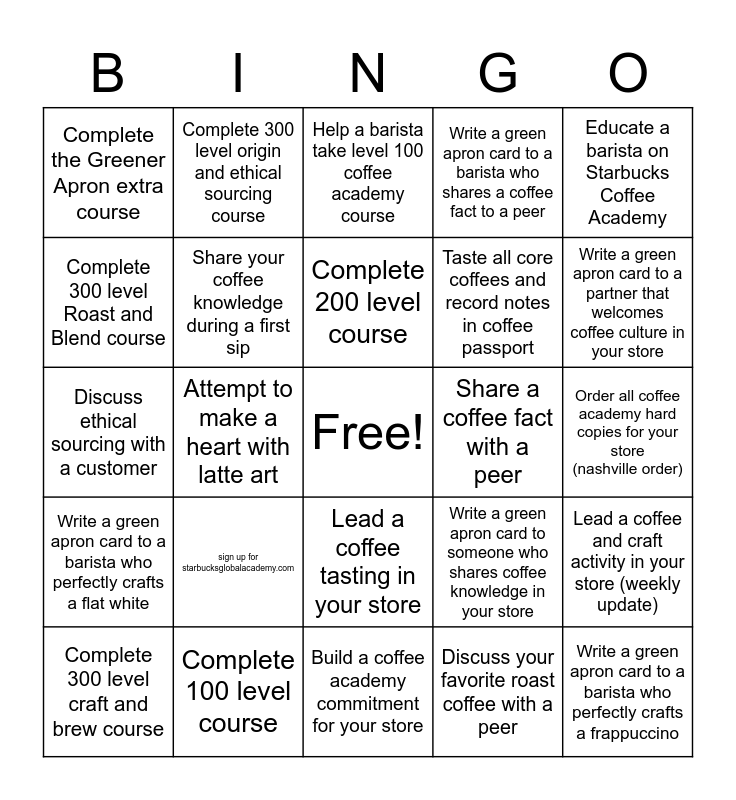 This bingo card has a free space and 24 words: sign up for starbucksglobalacademy.com, Complete 100 level course, Complete 200 level course, Complete 300 level craft and brew course, Educate a barista on Starbucks Coffee Academy, Complete the Greener Apron extra course, Complete 300 level Roast and Blend course, Complete 300 level origin and ethical sourcing course, Share a coffee fact with a peer, Lead a coffee tasting in your store, Taste all core coffees and record notes in coffee passport, Discuss ethical sourcing with a customer, Write a green apron card to someone who shares coffee knowledge in your store, Lead a coffee and craft activity in your store (weekly update), Share your coffee knowledge during a first sip, Discuss your favorite roast coffee with a peer, Order all coffee academy hard copies for your store (nashville order), Help a barista take level 100 coffee academy course, Write a green apron card to a partner that welcomes coffee culture in your store, Attempt to make a heart with latte art, Write a green apron card to a barista who perfectly crafts a frappuccino, Write a green apron card to a barista who perfectly crafts a flat white, Write a green apron card to a barista who shares a coffee fact to a peer and Build a coffee academy commitment for your store.