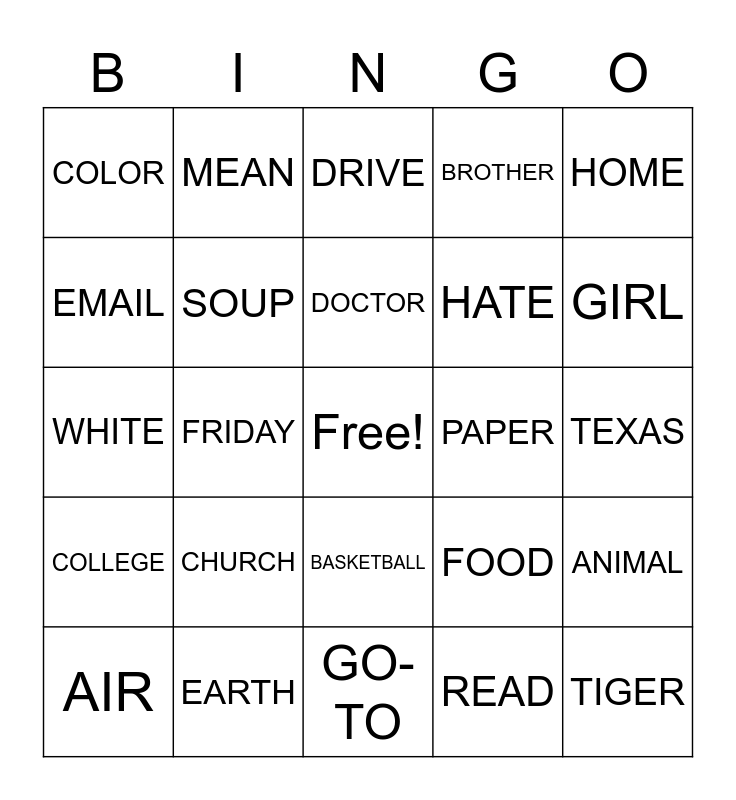 This bingo card has a free space and 24 words: CHURCH, EARTH, DOCTOR, AIR, HOME, COLOR, EMAIL, MEAN, PAPER, BASKETBALL, HATE, WHITE, FOOD, ANIMAL, SOUP, READ, TEXAS, DRIVE, GIRL, FRIDAY, TIGER, COLLEGE, BROTHER and GO-TO.