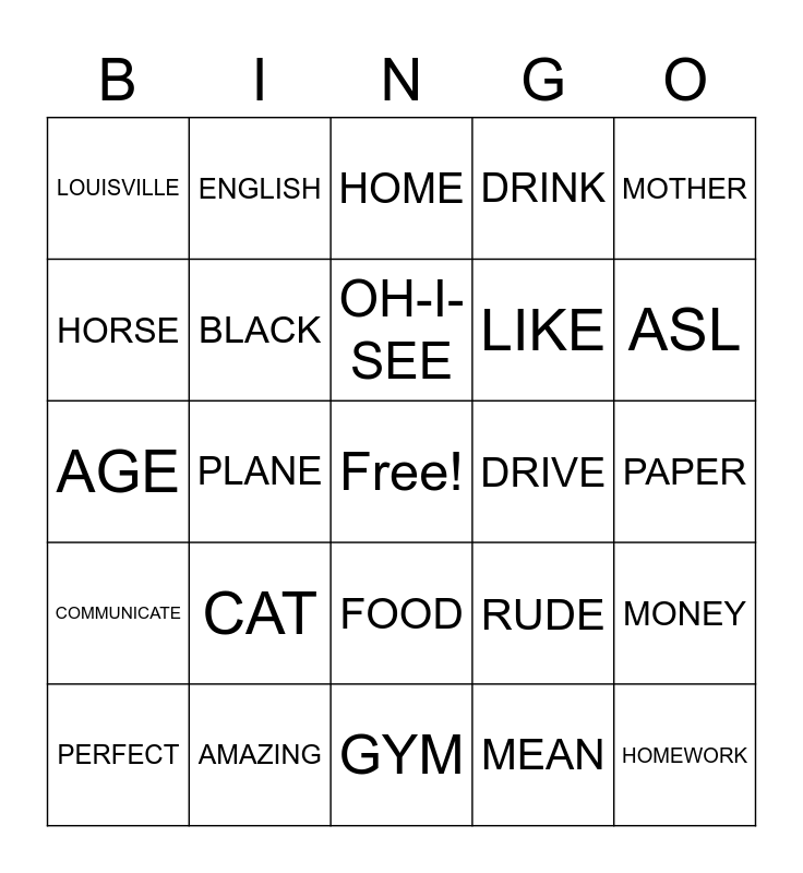 This bingo card has a free space and 24 words: CAT, AMAZING, OH-I-SEE, PERFECT, MOTHER, LOUISVILLE, HORSE, ENGLISH, DRIVE, FOOD, LIKE, AGE, RUDE, MONEY, BLACK, MEAN, PAPER, HOME, ASL, PLANE, HOMEWORK, COMMUNICATE, DRINK and GYM.