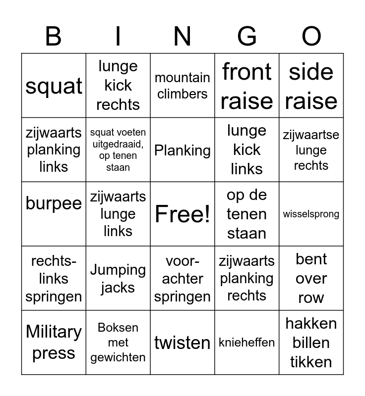 This bingo card has a free space and 24 words: Jumping jacks, Boksen met gewichten, Planking, Military press, side raise, squat, zijwaarts planking links, lunge kick rechts, op de tenen staan, voor-achter springen, lunge kick links, burpee, zijwaarts planking rechts, bent over row, squat voeten uitgedraaid, op tenen staan, knieheffen, wisselsprong, mountain climbers, zijwaartse lunge rechts, zijwaarts lunge links, hakken billen tikken, rechts-links springen, front raise and twisten.