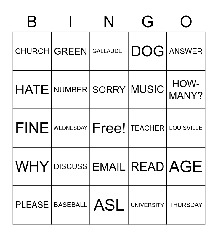 This bingo card has a free space and 24 words: DISCUSS, BASEBALL, SORRY, PLEASE, ANSWER, CHURCH, HATE, GREEN, TEACHER, EMAIL, MUSIC, FINE, READ, AGE, NUMBER, UNIVERSITY, LOUISVILLE, GALLAUDET, HOW-MANY?, WEDNESDAY, THURSDAY, WHY, DOG and ASL.
