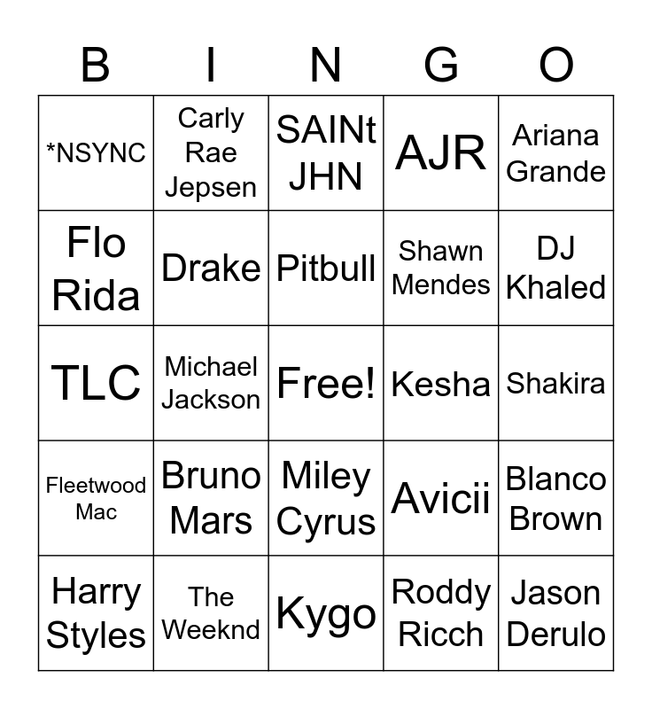 This bingo card has a free space and 44 words: 24kGoldn, Jason Derulo, Justin Bieber, Harry Styles, BTS, Roddy Ricch, SAINt JHN, Lady Gaga, Ariana Grande, The Weeknd, AJR, Kesha, Miley Cyrus, Bruno Mars, Metro Station, Kygo, Whitney Houston, TLC, Lil Nas X, DJ Khaled, Carly Rae Jepsen, The Killers, Backstreet Boys, *NSYNC, Fountains of Wayne, Shakira, Lizzo, Sam Hunt, Avicii, Fleetwood Mac, Luke Combs, Blanco Brown, Rick Astley, Frankie Valli, Michael Jackson, Mumford & Sons, The Chainsmokers, Jonas Brothers, Pitbull, Flo Rida, Shawn Mendes, Dua Lipa, Drake and Black Eyed Peas.