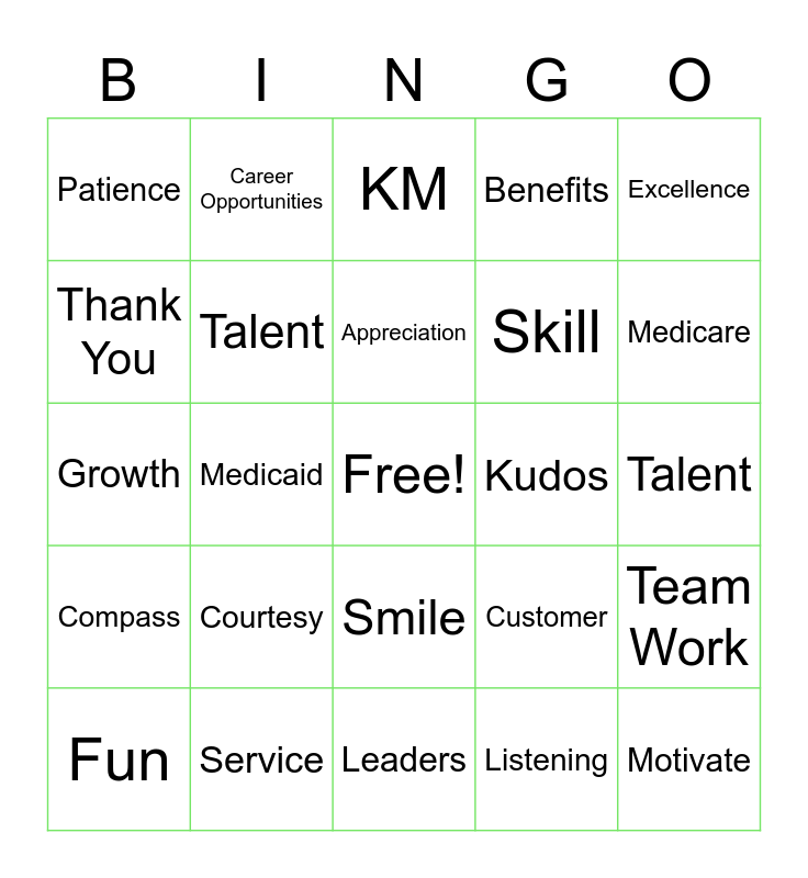 This bingo card has a free space and 24 words: Courtesy, Service, Appreciation, Fun, Excellence, Patience, Thank You, Career Opportunities, Kudos, Smile, Skill, Growth, Customer, Team Work, Talent, Listening, Talent, KM, Medicare, Medicaid, Motivate, Compass, Benefits and Leaders.
