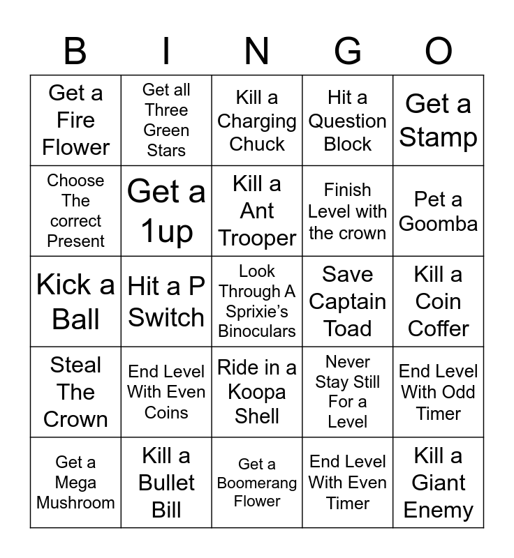 This bingo card has 55 words: Get the top of the flag pole, Get a Mega Mushroom, Get a Cat Bell, Get a Fire Flower, Get a Boomerang Flower, Catch a Bunny, Get a 1up, Get a green star, Finish Level with the crown, Get a Mushroom, Hit a Question Block, Kill a Goomba, Kill a Koopa Trooper, Go into a Warp Box, Climb a Tree, Hit a Pow Box, Get a Stamp, Hit a P Switch, Kill Another Player, Look Through A Sprixie’s Binoculars, Save Captain Toad, Stay Still For a Level, Never Stay Still For a Level, Kill a Charging Chuck, Kill a Conkdor, Kill a Ant Trooper, End Level With Even Timer, Use a Clear Pipe, Kill a Coin Coffer, End Level With Odd Timer, Find A Secret Exit, Collect a Coin, Defeat a Boss, Get a Mushroom, Choose The correct Present, Kick a Ball, Find a Invisible Block, Steal The Crown, Kill a Giant Enemy, End Level With Odd Coins, Get all Three Green Stars, Finish A Red Coin Challenge, Get Extra Time, End Level Small, End Level With Even Coins, Kill a Bullet Bill, Kill a Skip Squeak, Get a Power Up Hat, Beat A World, Pet a Goomba, Kill a bully, Kill a Hammer Bro, Kill a Stingby, Ride in a Koopa Shell and Ride in a goomba Ice Skate.