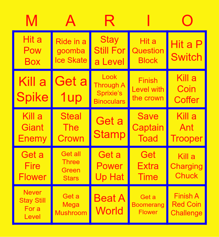 This bingo card has 58 words: Get the top of the flag pole, Get a Mega Mushroom, Get a Cat Bell, Get a Fire Flower, Get a Boomerang Flower, Catch a Bunny, Get a 1up, Get a green star, Finish Level with the crown, Get a Mushroom, Hit a Question Block, Kill a Goomba, Kill a Koopa Trooper, Go into a Warp Box, Climb a Tree, Hit a Pow Box, Get a Stamp, Hit a P Switch, Kill Another Player, Look Through A Sprixie’s Binoculars, Save Captain Toad, Stay Still For a Level, Never Stay Still For a Level, Kill a Charging Chuck, Kill a Conkdor, Kill a Ant Trooper, End Level With Even Timer, Use a Clear Pipe, Kill a Coin Coffer, End Level With Odd Timer, Find A Secret Exit, Collect a Coin, Defeat a Boss, Get a Mushroom, Choose The correct Present, Kick a Ball, Find a Invisible Block, Steal The Crown, Kill a Giant Enemy, End Level With Odd Coins, Get all Three Green Stars, Finish A Red Coin Challenge, Get Extra Time, End Level Small, End Level With Even Coins, Kill a Bullet Bill, Kill a Skip Squeak, Get a Power Up Hat, Beat A World, Pet a Goomba, Kill a bully, Kill a Hammer Bro, Kill a Stingby, Ride in a Koopa Shell, Ride in a goomba Ice Skate, 100% Complete a Level, Kill a Spike and Have all four Players get the flagpole top.