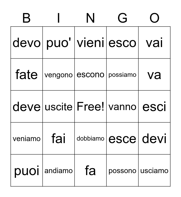 This bingo card has a free space and 36 words: vado, venite, andate, vengono, esce, veniamo, escono, faccio, vai, viene, uscite, esco, posso, vanno, va, devo, vengo, fai, usciamo, vieni, esci, devi, andiamo, puoi, fa, puo', deve, facciamo, possiamo, fate, fanno, potete, possono, dobbiamo, dovete and devono.