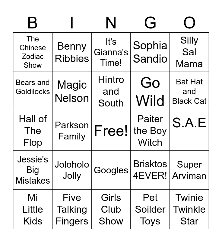 This bingo card has a free space and 34 words: The Pemoteas, Pet Soilder Toys, Triple Trio Boys, Space Vackers, Jessie's Big Mistakes, Magic Nelson, Silly Sal Mama, Mi Little Kids, Benny Ribbies, The Bag of Peanuts, Hintro and South, It's Gianna's Time!, Ailly Sliono and Friends, Four Nintone Boys, Paiter the Boy Witch, Bat Hat and Black Cat, Five Talking Fingers, Hall of The Flop, Joloholo Jolly, Brisktos 4EVER!, Googles, Rainbow Girls, The Chinese Zodiac Show, S.A.E, Girls Club Show, Twinie Twinkle Star, Sophia Sandio, Lebers R-SEVEN, Go Wild, Bears and Goldilocks, Tim K. and Tim W., Parkson Family, Super Arviman and Lormwill: Do You See What I Saw?.