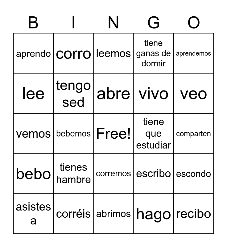 This bingo card has a free space and 29 words: asistes a, come, bebemos, viven, aprendo, leemos, tengo sed, tienes hambre, tiene que estudiar, corréis, comparten, recibo, abrimos, hago, veo, asistimos a, corremos, bebo, aprendemos, vemos, escribo, escondes, vivo, lee, tiene ganas de dormir, corro, escondo, abre and vivo.