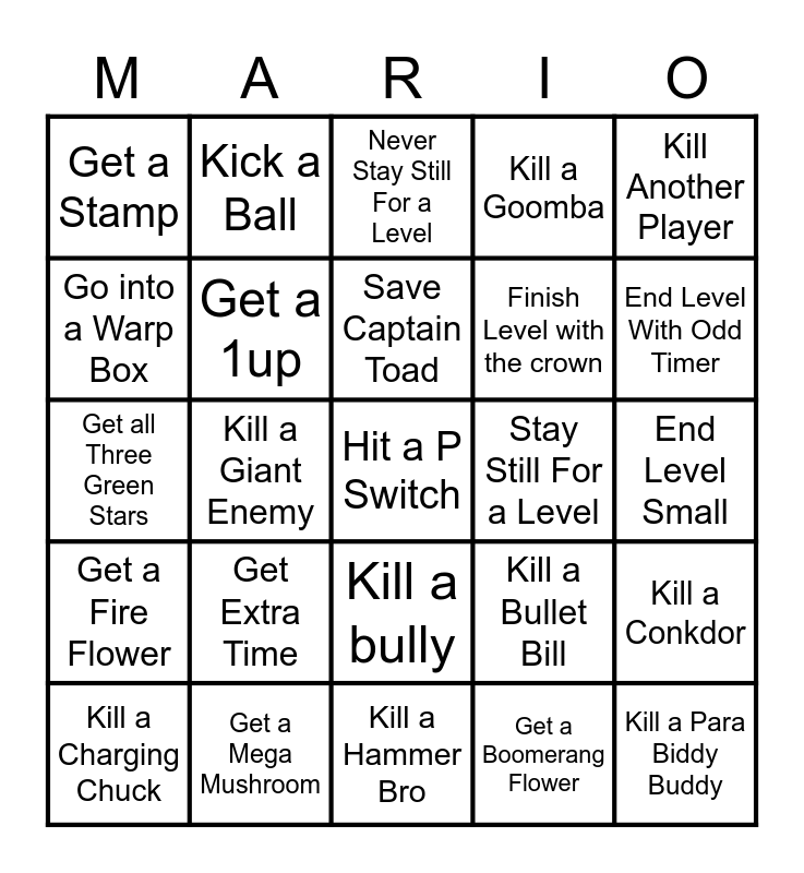 This bingo card has 61 words: Get the top of the flag pole, Get a Mega Mushroom, Get a Cat Bell, Get a Fire Flower, Get a Boomerang Flower, Catch a Bunny, Get a 1up, Get a green star, Finish Level with the crown, Hit a Question Block, Kill a Goomba, Kill a Koopa Trooper, Go into a Warp Box, Climb a Tree, Hit a Pow Box, Get a Stamp, Hit a P Switch, Kill Another Player, Look Through A Sprixie’s Binoculars, Save Captain Toad, Stay Still For a Level, Never Stay Still For a Level, Kill a Charging Chuck, Kill a Conkdor, Kill a Ant Trooper, End Level With Even Timer, Use a Clear Pipe, Kill a Coin Coffer, End Level With Odd Timer, Find A Secret Exit, Collect a Coin, Defeat a Boss, Get a Mushroom, Choose The correct Present, Kick a Ball, Find a Invisible Block, Steal The Crown, Kill a Giant Enemy, End Level With Odd Coins, Get all Three Green Stars, Finish A Red Coin Challenge, Get Extra Time, End Level Small, End Level With Even Coins, Kill a Bullet Bill, Kill a Skip Squeak, Get a Power Up Hat, Beat A World, Pet a Goomba, Kill a bully, Kill a Hammer Bro, Kill a Stingby, Ride in a Koopa Shell, Ride in a goomba Ice Skate, 100% Complete a Level, Kill a Spike, Have all four Players get the flagpole top, Finish A Green Coin Challenge, Use a Amiibo, Kill a Para Biddy Buddy and Throw a Bomb omb at a player.