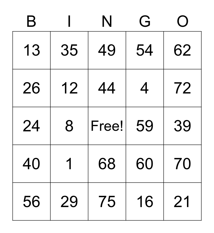 This bingo card has a free space and 24 words: 1, 29, 44, 56, 62, 13, 26, 35, 59, 68, 4, 24, 60, 70, 12, 16, 39, 49, 72, 8, 21, 40, 54 and 75.
