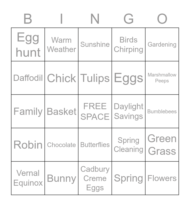 This bingo card has a free space and 24 words: Chocolate, Bunny, Tulips, Vernal Equinox, Gardening, Egg hunt, Daffodil, Warm Weather, Daylight Savings, Butterflies, Eggs, Family, Spring Cleaning, Green Grass, Chick, Spring, Bumblebees, Sunshine, Marshmallow Peeps, Basket, Flowers, Robin, Birds Chirping and Cadbury Creme Eggs.