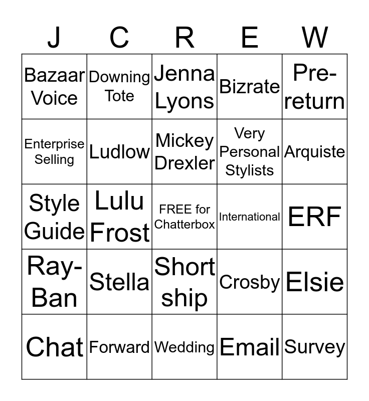 This bingo card has a free space and 24 words: Stella, Forward, Mickey Drexler, Chat, Pre-return, Bazaar Voice, Enterprise Selling, Downing Tote, International, Short ship, Very Personal Stylists, Style Guide, Crosby, Elsie, Ludlow, Email, ERF, Jenna Lyons, Arquiste, Lulu Frost, Survey, Ray-Ban, Bizrate and Wedding.