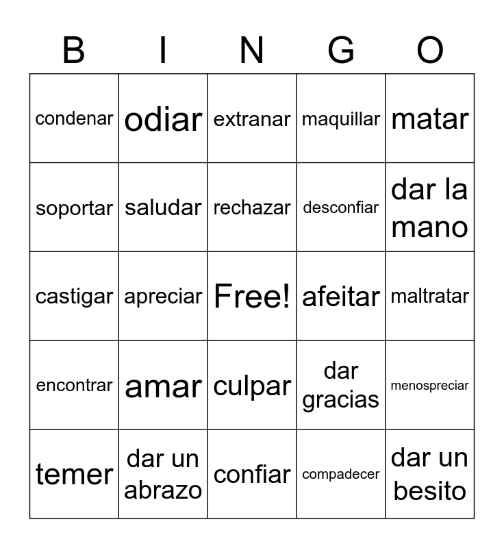 This bingo card has a free space and 24 words: amar, dar un abrazo, rechazar, temer, matar, condenar, soportar, odiar, afeitar, culpar, desconfiar, castigar, dar gracias, menospreciar, saludar, compadecer, maltratar, extranar, dar la mano, apreciar, dar un besito, encontrar, maquillar and confiar.