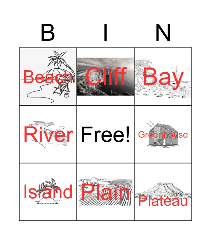This bingo card has 15 images, a free space and 15 words: Natural Landscape, Oil rig, Bay, Beach, Plain, Plateau, Solar Panels, Man-Made Landscape, Greenhouse, Mountain Range, Valley, River, Island, Cliff and Cape.