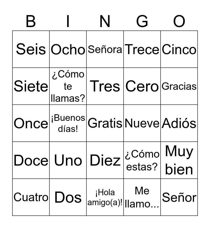 This bingo card has a free space and 24 words: Uno, Dos, Tres, Cuatro, Cinco, Seis, Siete, Ocho, Nueve, Diez, Cero, Once, ¿Cómo estas?, Muy bien, ¿Cómo te llamas?, Me llamo..., Adiós, Señora, Gracias, ¡Buenos días!, Señor, Doce, Trece and ¡Hola amigo(a)!.