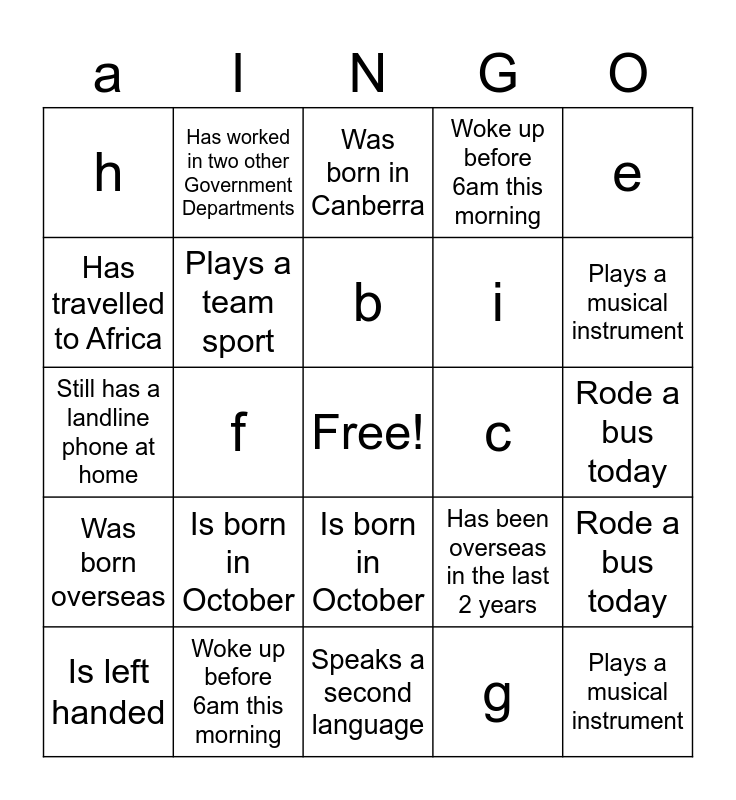 This bingo card has a free space and 47 words: Drives a red car, Plays a musical instrument, Is left handed, Speaks a second language, Is born in October, Was born overseas, Has worked in two other Government Departments, Has a cat, Has travelled to Africa, Is an only child, Plays a team sport, Woke up before 6am this morning, Rode a bus today, Has been overseas in the last 2 years, Has lived in Queensland, a, b, c, d, e, f, g, h, i, Drives an SUV, Plays a musical instrument, Is left handed, Speaks a second Language, Is born in October, Was born overseas, Has worked at two other government departments, Has a cat, Has travelled to Africa, Is an only child, Plays a team sport, Woke up before 6am this morning, Rode a bus today, Has been overseas in the last 12 months, Has lived in Queensland, Has been on TV, Has a degree not in economics, Was born in Canberra, Still has a landline phone at home, Has been part of a choir, Has read every Harry Potter Book, Has seen every Star Wars film and Has broken a bone.