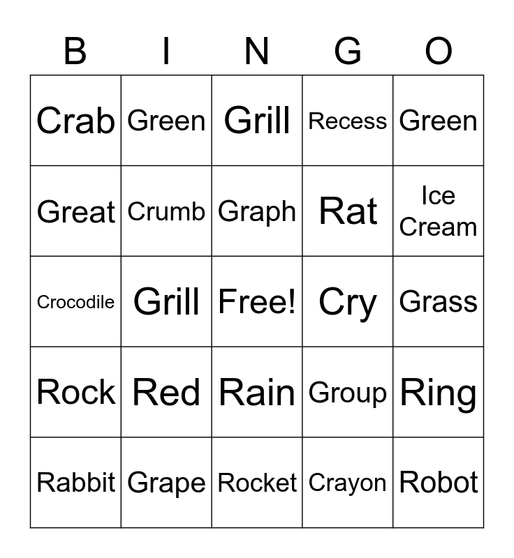 This bingo card has a free space and 24 words: Red, Grape, Graph, Rabbit, Green, Crab, Great, Green, Cry, Rain, Rat, Crocodile, Group, Ring, Crumb, Crayon, Grass, Grill, Ice Cream, Grill, Robot, Rock, Recess and Rocket.