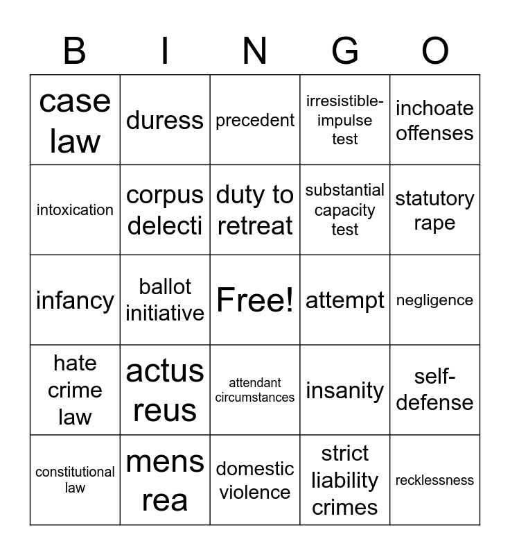 This bingo card has a free space and 29 words: constitutional law, statutory law, ballot initiative, administrative law, case law, precedent, corpus delecti, actus reus, attempt, mens rea, negligence, recklessness, domestic violence, strict liability crimes, statutory rape, felony-murder, attendant circumstances, hate crime law, inchoate offenses, infancy, insanity, M'Naughten Rule, substantial capacity test, intoxication, irresistible-impulse test, duress, self-defense, duty to retreat and necessity.