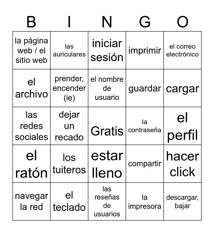 This bingo card has a free space and 60 words: el ordenador, el teclado, el monitor, el ratón, la impresora, las bocinas, prender, encender (ie), apagar, guardar, borrar, imprimir, teclear / escribir a máquina, el archivo, el internet, la red, la conexión inalámbrica, la página web / el sitio web, descargar, bajar, el correo electrónico, la arroba, el nombre de usuario, la contraseña, iniciar sesión, navegar la red, hacer click, la página principal, el ciberacoso, la pantalla táctil, el portátil, cargar, el cargador, deslizar, el móvil, el teléfono celular, el muro, el mensaje de texto, las auriculares, llamar, la llamada, dejar un recado, contestar, las redes sociales, el tuit, los tuiteros, el perfil, los chismes, compartir, los desconocidos, las notificaciones, estar descompuesto, estar lento, estar lleno, las reseñas de usuarios, el enlace, tuitear/retuitear, etiquetar, la ventaja (la desventaja), funcionar, almacenar, mandar/enviar, la búsqueda and actualizar.