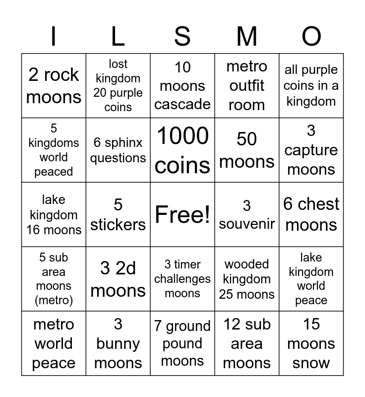 This bingo card has a free space and 24 words: 3 2d moons, 3 bunny moons, 1000 coins, metro world peace, all purple coins in a kingdom, 2 rock moons, 5 kingdoms world peaced, lost kingdom 20 purple coins, 3 souvenir, 3 timer challenges moons, 50 moons, lake kingdom 16 moons, wooded kingdom 25 moons, lake kingdom world peace, 6 sphinx questions, 12 sub area moons, 6 chest moons, 10 moons cascade, 3 capture moons, 5 stickers, 15 moons snow, 5 sub area moons (metro), metro outfit room and 7 ground pound moons.