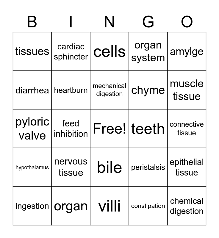 This bingo card has a free space and 36 words: Homeostasis, ulcer, epiglottis, heartburn, peristalsis, hypothalamus, mechanical digestion, elimination, amylge, saliva, feed inhibition, organ system, absorption, teeth, muscle tissue, tissues, digestion, nervous tissue, chemical digestion, cells, connective tissue, epithelial tissue, organ, ingestion, villi, cardiac sphincter, pyloric valve, proteins and lipids, chyme, diarrhea, microvilli, large intestine, constipation, bile, gall bladder and fats, carbohydrates, and proteins.