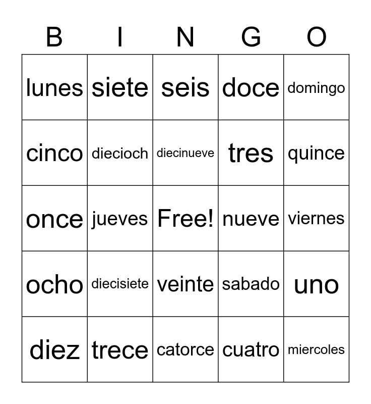 This bingo card has a free space and 28 words: uno, dos, tres, cuatro, cinco, seis, siete, ocho, nueve, diez, once, doce, trece, catorce, quince, dieciseis, diecisiete, diecioch, diecinueve, veinte, lunes, martes, miercoles, jueves, viernes, sabado, domingo and cero.