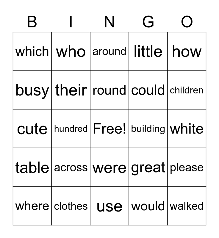 This bingo card has a free space and 24 words: across, clothes, round, where, how, which, busy, who, building, were, could, cute, great, please, their, would, white, around, children, hundred, walked, table, little and use.