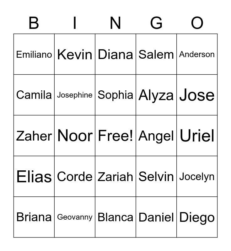 This bingo card has a free space and 29 words: Briana, Nidia, Noor, Adrian, Emiliano, Diana, Josephine, Corde, Angel, Geovanny, Uriel, Diego, Blanca, Daniel, Jose, Tino, Zariah, Elias, Anderson, Zaher, Selvin, Joshua, Alyza, Camila, Salem, Kevin, Jocelyn, Sophia and Eric.