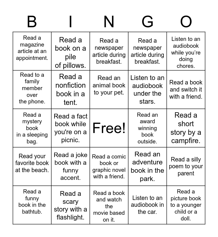 This bingo card has a free space and 24 words: Read a joke book with a funny accent., Read a scary story with a flashlight., Read an animal book to your pet., Read a funny book in the bathtub., Listen to an audiobook while you’re doing chores., Read a magazine article at an appointment., Read to a family member over the phone., Read a book on a pile of pillows., Read an award winning book outside., Read a comic book or graphic novel with a friend., Listen to an audiobook under the stars., Read a mystery book in a sleeping bag., Read an adventure book in the park., Read a silly poem to your parent, Read a nonfiction book in a tent., Listen to an audiobook in the car., Read a short story by a campfire., Read a newspaper article during breakfast., Read a book and switch it with a friend., Read a fact book while you're on a picnic., Read a picture book to a younger child or a doll., Read your favorite book at the beach., Read a newspaper article during breakfast. and Read a book and watch the movie based on it..