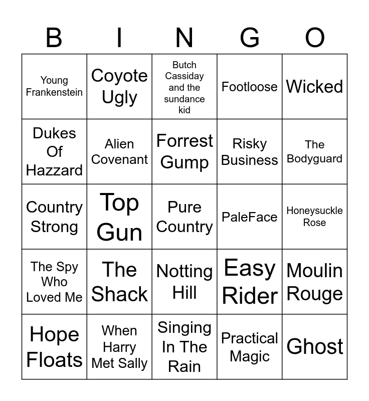 This bingo card has a free space and 27 words: Easy Rider, Walk The Line, Risky Business, Singing In The Rain, Dukes Of Hazzard, Butch Cassiday and the sundance kid, Coyote Ugly, The Spy Who Loved Me, PaleFace, Moulin Rouge, Country Strong, Footloose, Hope Floats, When Harry Met Sally, The Bodyguard, Con Air, Alien Covenant, Forrest Gump, The Shack, Young Frankenstein, Honeysuckle Rose, Practical Magic, Top Gun, Ghost, Notting Hill, Wicked and Raiders of the lost Ark.